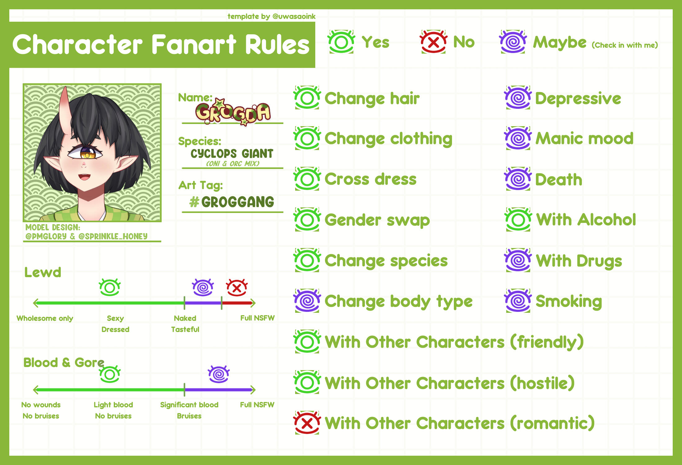 Naked Tasteful: Please check with me on this topic 100% of the time.Blood & Gore: for the most part I see no issues with this type on fanart however I am not the most well versed in these themes and styles so please check with me first.Change Body Type: This could mean a very large variety of things, most of which I am fine by, however please never depict me as a loli/baby/child.Depressive: Sad depictions are all fine and good, but please refrain from any self harm imagery.Manic Mood: While I have zero qualms with being depicted as "crazy" or "wild" or even "unhinged", mania is real condition many people suffer with including myself, please do not put any of my mental health issues on display via fanart.Death: Comedic or story based depictions are fine. References to real life death or my pets in any way will result in being blocked.With Drugs: Only acceptable drugs; alcohol, tobacco, marijuana, and some select fantasy drugs.Smoking: All smoking is fine except for vapes.